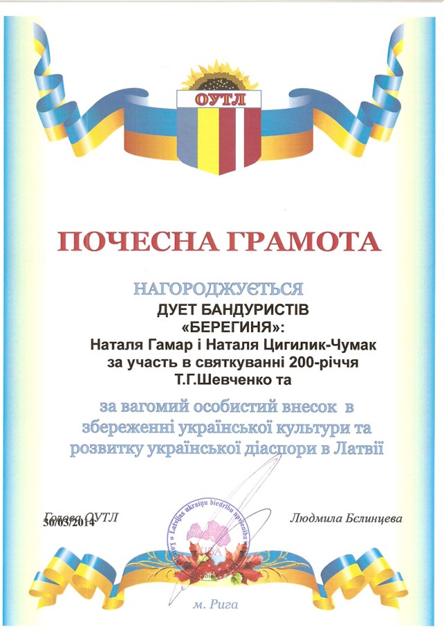 За участь у святковій академії, присвяченій відзначенню 200-тих роковин від дня народження Т. Шевченка та за вагомий особистий внесок в збереженні української культури та розвитку української діаспори в Латвії, бандуристки були нагороджені Почесною грамотою Об’єднання українських товариств Латвії.