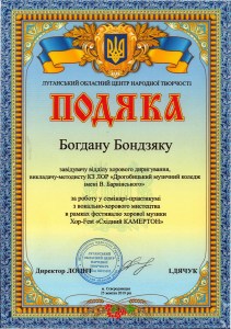 Різноплановою та репертуарно насиченою концертною програмою потішив слухачів Луганщини хор відділу хорового диригування під керівництвом Богдана Бондзяка. Це і концерти для викладачів мистецьких навчальних закладів Луганської області – учасників семінару-практикуму «Мистецтво ХХІ століття» та для керівників аматорських хорових колективів і методистів музичного жанру клубних закладів Луганської області в стінах Сєвєродонецького коледжу культури і мистецтв імені Сергія Прокоф’єва, і виїзний концерт для жителів міста Сватове. Твори, що звучали, репрезентували калейдоскопічну картину розвитку сучасної музичної культури центральної України (твори Рубена Толмачова, Олександра Бондаренко), Галичини (твори Андрія Кушніренко), Буковини (твори Олени Чмут), а також найближчого зарубіжжя – твори сучасних польських композиторів Пьотра Янчака, Мікулаша Шнайдер-Трнавського, Ромуальда Твардовського.