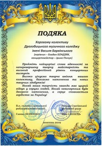 Хотілось би подякувати за насичену подіями творчу подорож Сєвєродонецькому коледжу культури і мистецтв імені Сергія Прокоф’єва в особі директора, заслуженого діяча мистецтв України Марині Яворській, за змістовний супровід виступів – заслуженому працівнику культури України Наталії Пасічник, а також керівництву Дрогобицького музичного коледжу імені В.Барвінського Юрію Чумаку та Миколі Фендаку.