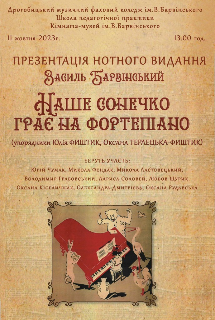 Отож, 11 жовтня в кімнаті-музеї В. Барвінського Дрогобицького Музичного Фахового Коледжу відбулася презентація збірника «Наше сонечко грає на фортепіано» В. Барвінського, редакторами і упорядниками якого є Оксана Терлецька-Фиштик та Юлія Фиштик. Багато щирих і вдячних слів прозвучало з уст Юрія Чумака, Миколи Ластовецького, Володимира Грабовського, Миколи Фендака, Оксани Кіселичник, Лариси Соловей та інші.
