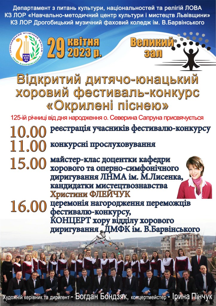 29 квітня 2023 року Дрогобицький музичний фаховий коледж імені В.Барвінського радо зустрів учасників Відкритого дитячо-юнацького хорового фестивалю-конкурсу «Окрилені піснею».