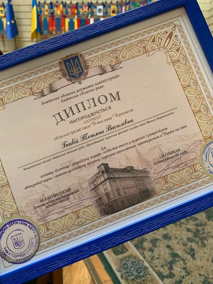 24 листопада 2021 року в залі головного корпусу Львівського національного університету імені І. Франка відбулось вручення Обласної премії імені В’ячеслава Чорновола за визначні досягнення студентів закладів передвищої фахової та вищої освіти за доробки в галузі гуманітарних і суспільних наук, які є важливими для Львівщини, сприяють подальшому розвитку науки, суспільному прогресу та утверджують високий авторитет вітчизняної науки у світі. Цього року знакову нагороду отримала студентка ІІІ курсу відділу теорії музики Тетяна Бабій.