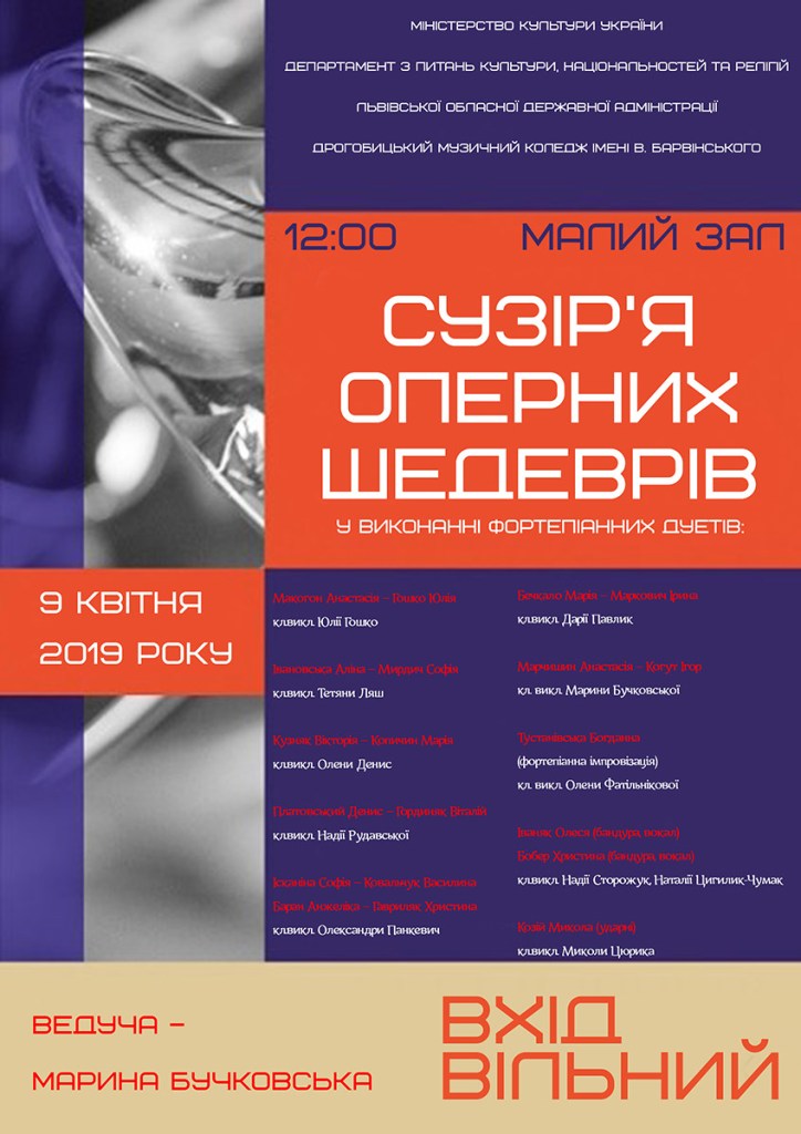 Історія розвитку оперного мистецтва свідчить про його великі потенційні можливості впливу на духовний світ людини, на пробудження міцних енергетичних ресурсів кожної особистості. Атмосферою неперевершеного свята оперних шедеврів, яке полонило свідомість та душу кожного слухача – професійного музиканта чи просто любителя музики, був пронизаний концерт «Сузір’я оперних шедеврів», котрий відбувся 09 квітня 2019 року в стінах Дрогобицького музичного коледжу імені В. Барвінського.