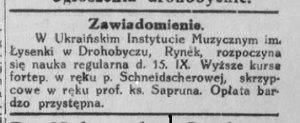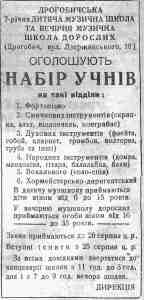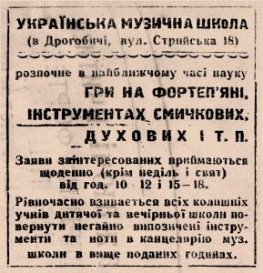 У часописі «Діло» № 37 від 22 травня 1923 року опубліковано оголошення (подається мовою оригіналу): «На днях відкрито в Дрогобичі Музичний Інститут, заходом Музичної комісії при Кружку У.П.Т. (Українське Педагогічне Товариство – авт.) в Дрогобичі. Приймаються вписи на шк. р.1923/24 на слідуючі предмети: 1) сольоспів, 2) гра на фортепяні, 3) гра на скрипці, 4) хоральний спів, 5) теорія музики, 6) історія музики, 7) гармонія музики. До учительського Збору заангажовано здібні фахові сили» [3]. 1 – 3 червня 1923 року в приміщенні Народного дому відбувся запис учнів на навчання.