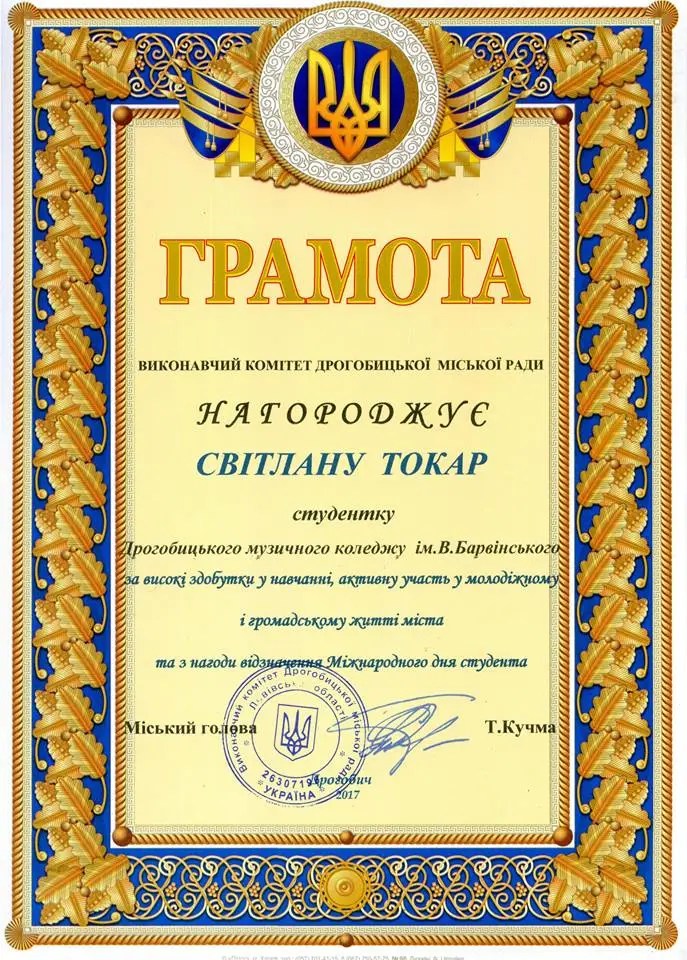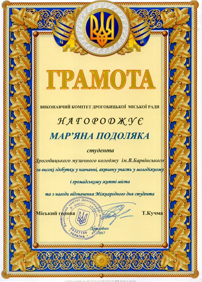 За активну громадську позицію, волонтерську діяльність та високі здобутки у навчанні двоє студентів ДМК ім. В. Барвінського відзначені поважною нагородою – Грамотою міського голови м. Дрогобича.