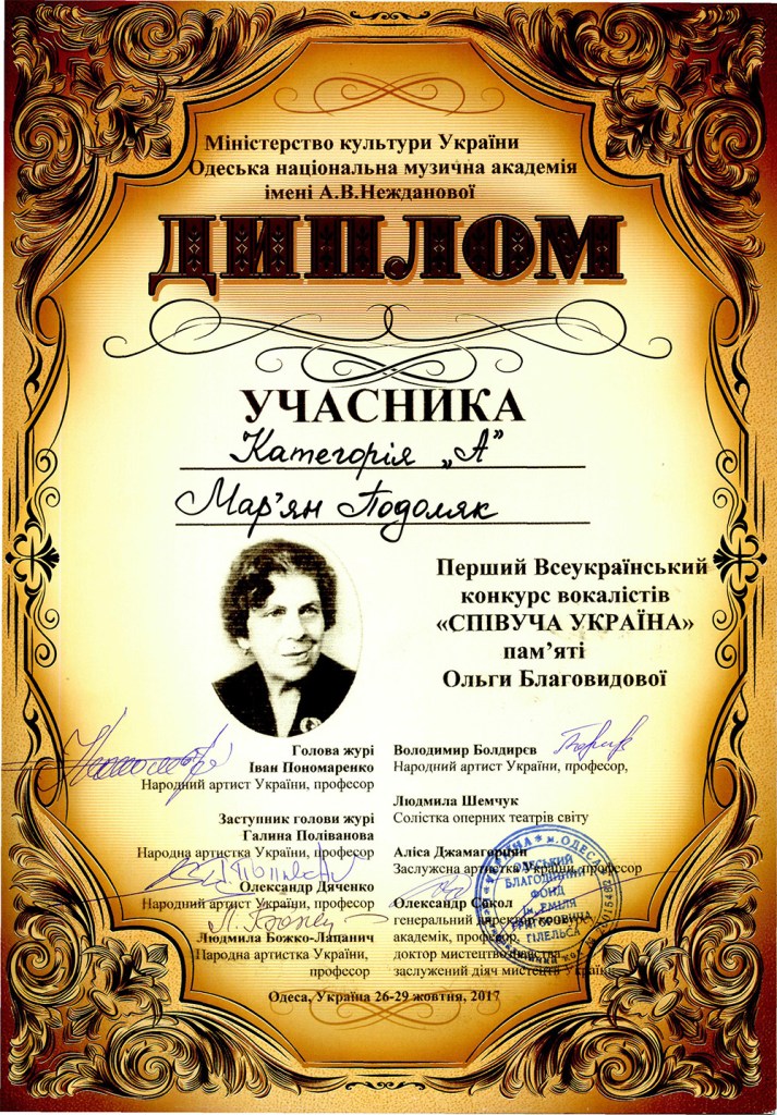 З 26-29 жовтня в м.Одеса відбувся І Всеукраїнський конкурс вокалістів «Співоча Україна» пам‘яті Олени Благовидової. За підсумками двох турів, студент ІІІ курсу Мар‘ян Подоляк (клас викладача-методиста Хороб Л.І.) отримав диплом конкурсу та матеріальну винагороду. Виконання конкурсної програми було на дуже високому професіональному рівні. Подоляк Мар‘ян був наймолодшим учасником у своїй категорії серед представників вокальних шкіл Києва, Одеси, Харкова, Львова.