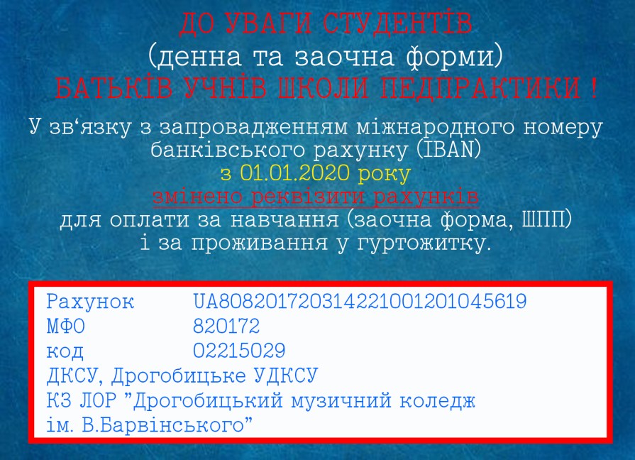 УВАГА! Змінено рахунок для оплати за навчання (заочна форма, школа педпрактики) та за проживання у гуртожитку