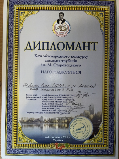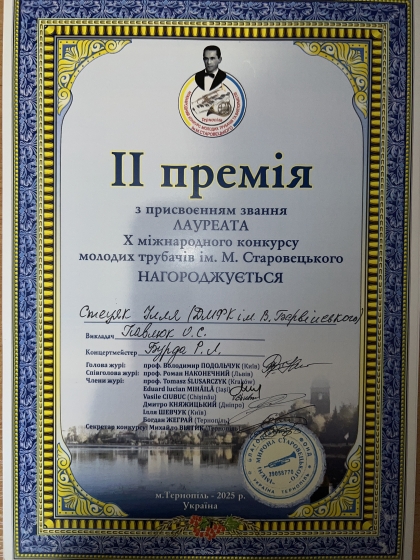 Лауреатом диплома ІІ ступеня став Ілля Стецяк. Дипломом конкурсу нагороджений викладач класу труби Олег Павлюк, який займався докладною підготовкою власних студентів до вдалих виступів на престижному змаганні.